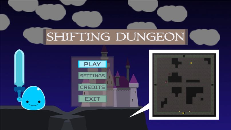 Shifting Dungeon is a top down Action RPG with both handmade and procedurally generated rooms. In this game, you control a slime out to get revenge on the castle full of monsters that kidnapped your daughter. Use traditional slime weapons such as guns and swords to fight your way back to the top!